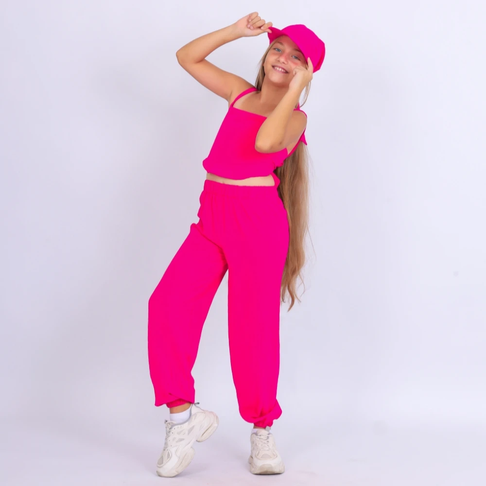 This simple outfit for young girls combines plain pants and a top with a back tie, made of CY fabric and featuring an elegant cap. This ensemble provides both comfort and style, making it the perfect choice for any occasion. The cape adds a touch of distinction and sophistication to your little girl's look, allowing her to shine with her natural beauty and innocence. Wear this outfit for a chic, comfortable, and contemporary look.