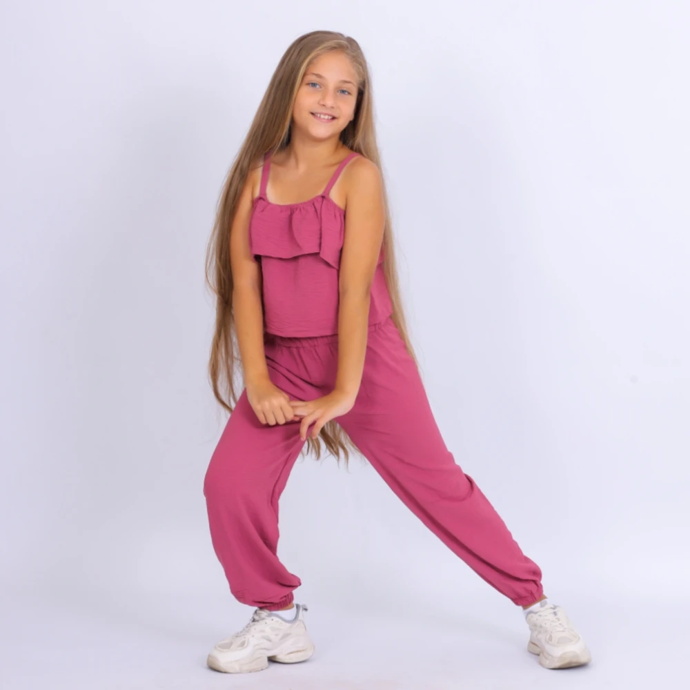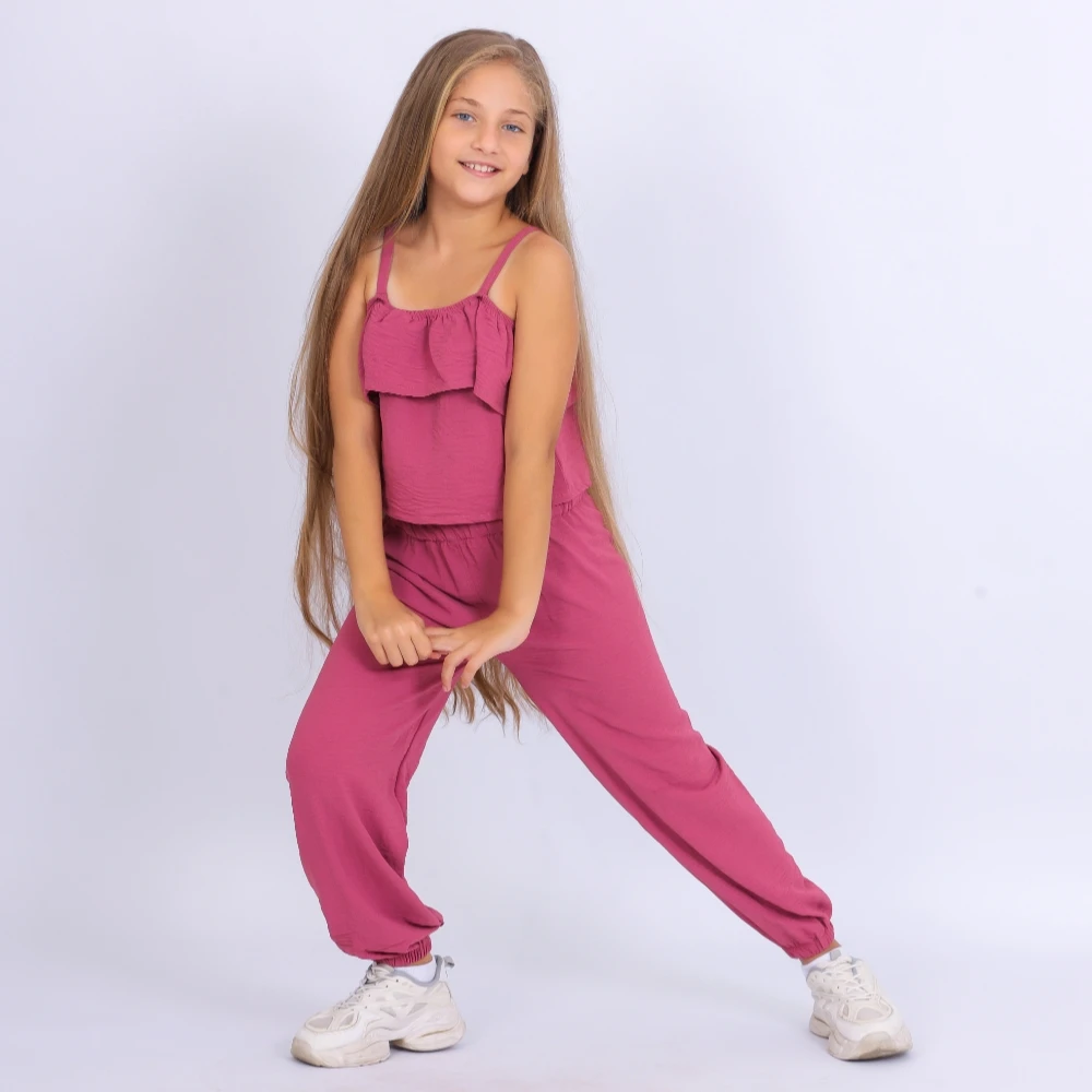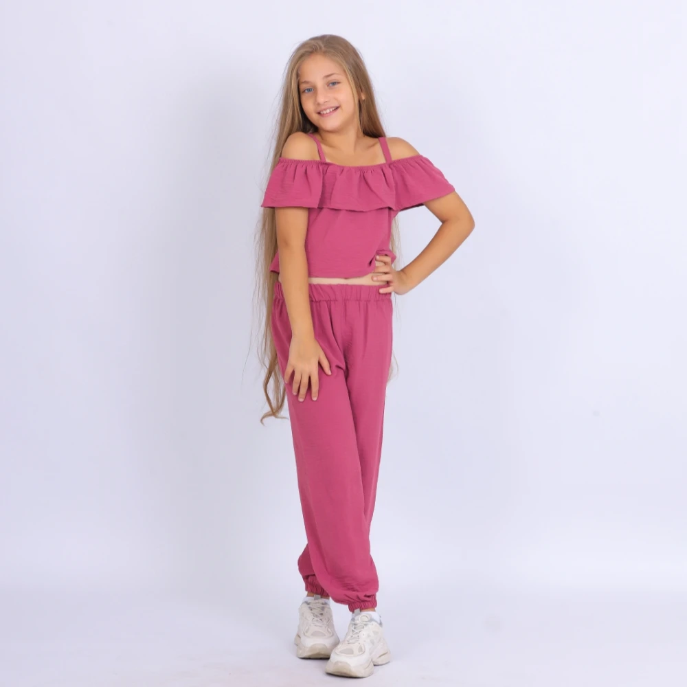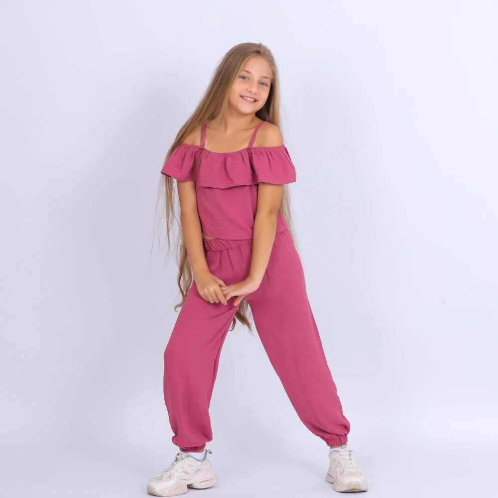 This fantastic girl's set combines simplicity and elegance, featuring plain pants with an elastic hem and a top that can be worn in multiple ways, making it a versatile piece. The CY fabric provides a feeling of comfort and durability, making it perfect for daily wear. You can pair the top with other pieces for various new looks, while the pants with their simple touches ensure a stylish and modern look for your little girl. Dress her up for a look that blends comfort and elegance for any occasion.