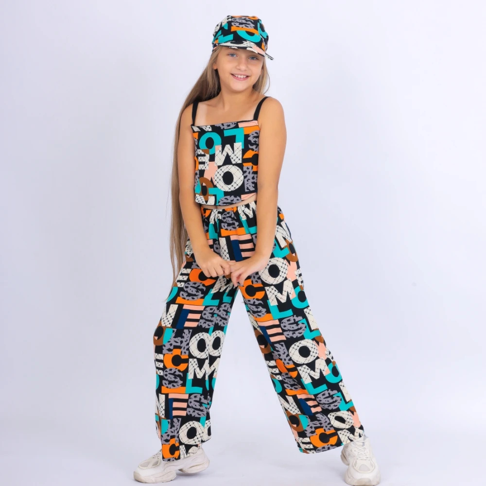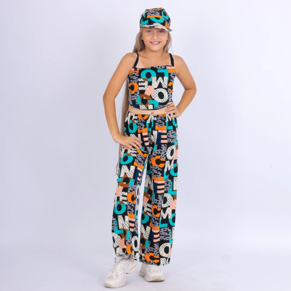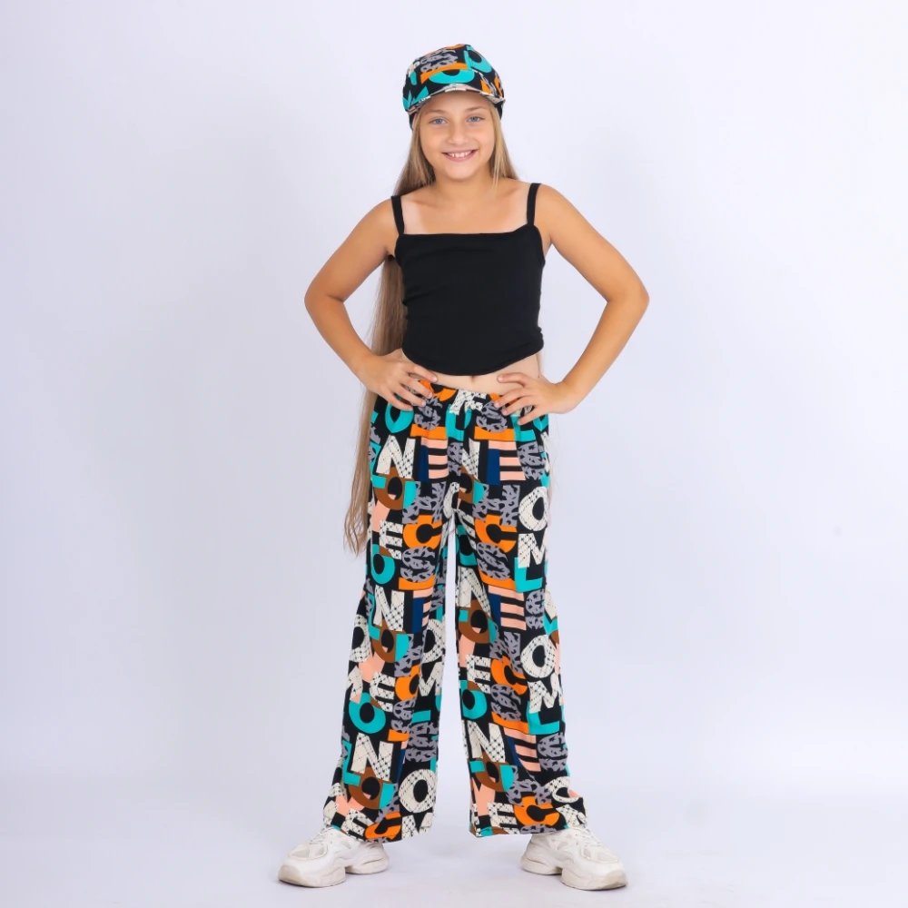 This modern girls' set features large printed letters on luxurious SBH fabric, consisting of comfortable pants and a top that can be worn in two different colors, along with an elegant cape that adds a touch of sophistication. The SBH fabric ensures superior comfort and high quality, making it an ideal choice for all occasions. Dress her in this bold and trendy outfit to reflect the playful spirit and innocence of childhood. Whether for a birthday party or a picnic in the park, this set offers both comfort and style for your little girl at every moment.