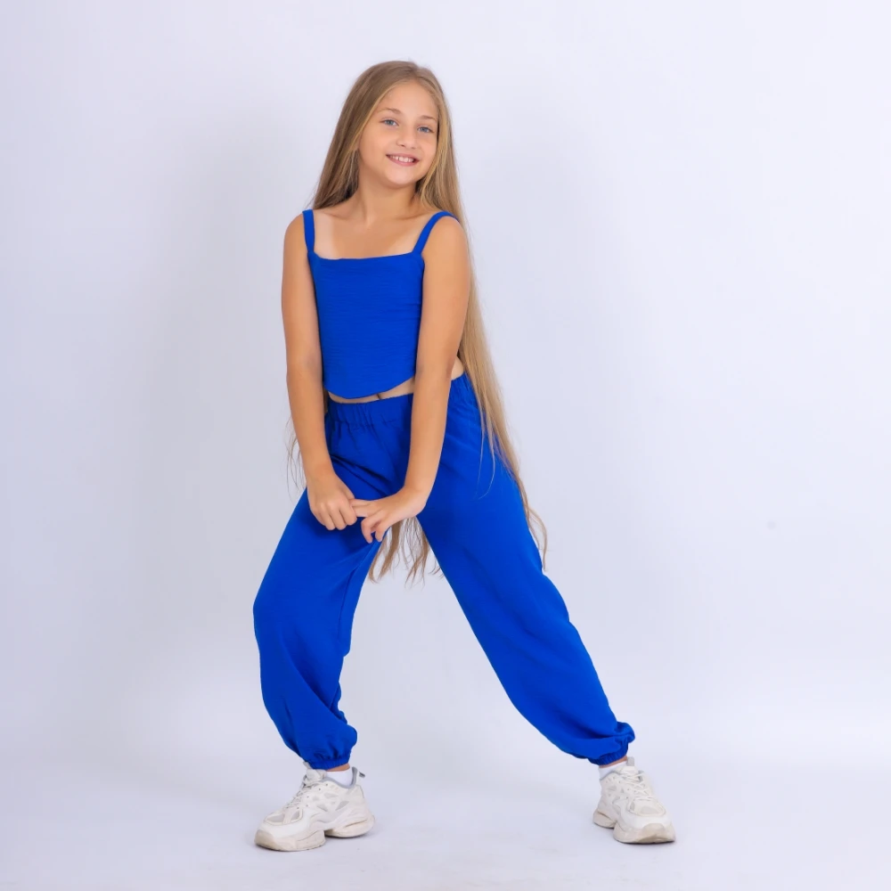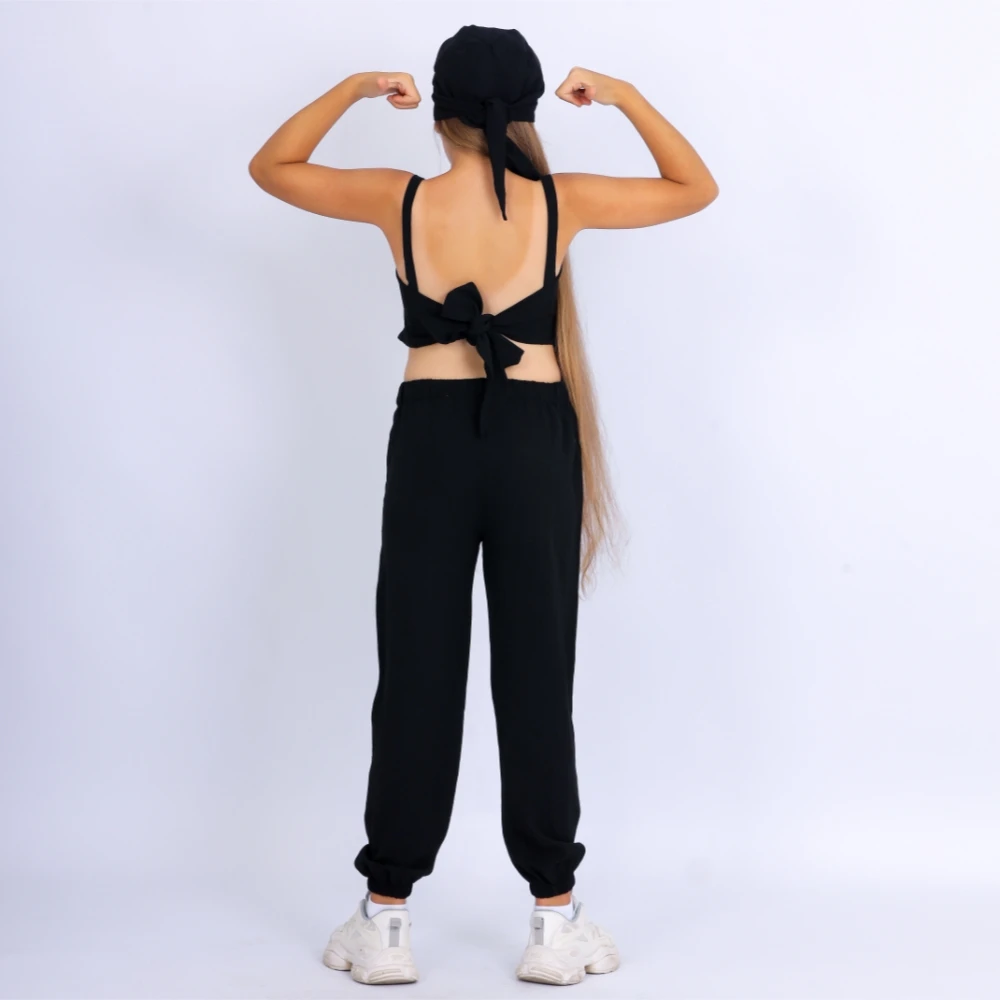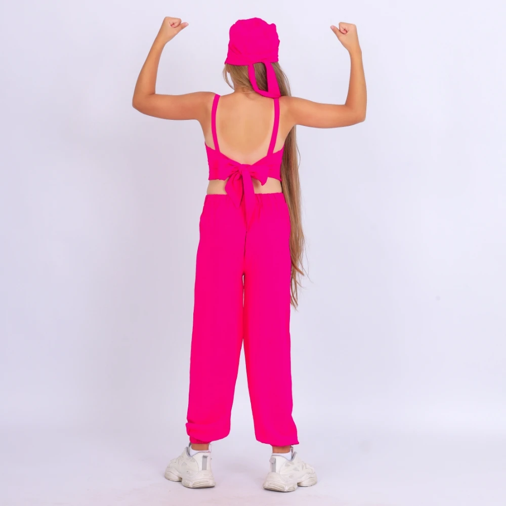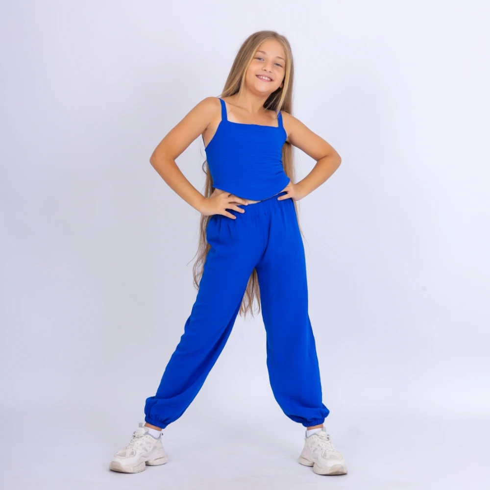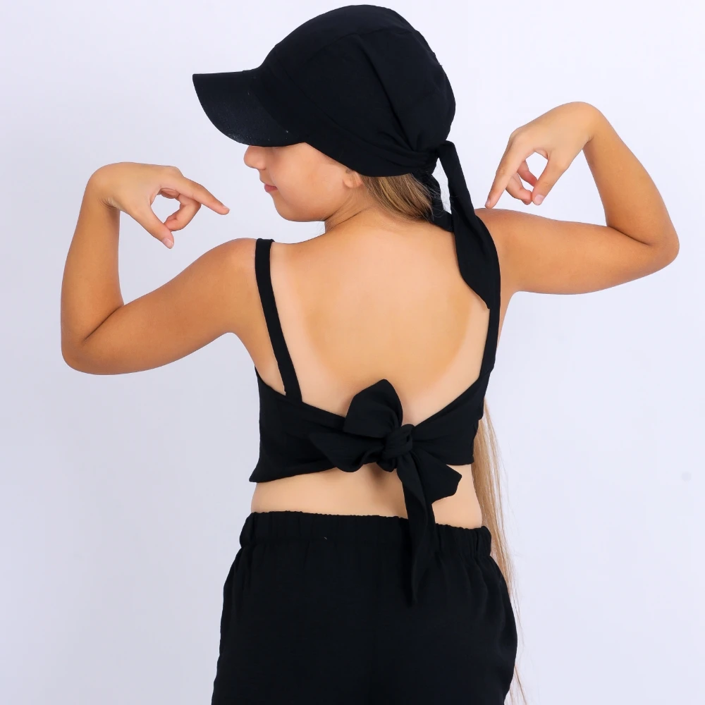 This simple outfit for young girls combines plain pants and a top with a back tie, made of CY fabric and featuring an elegant cap. This ensemble provides both comfort and style, making it the perfect choice for any occasion. The cape adds a touch of distinction and sophistication to your little girl's look, allowing her to shine with her natural beauty and innocence. Wear this outfit for a chic, comfortable, and contemporary look.