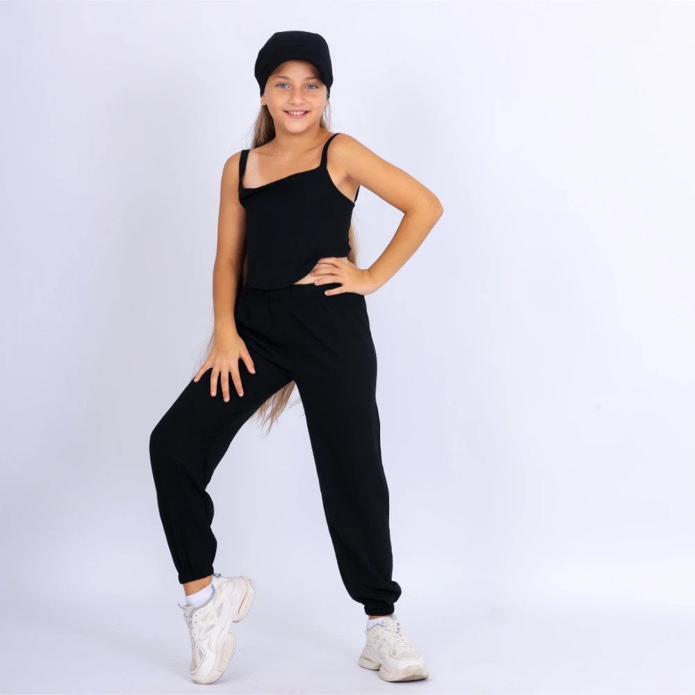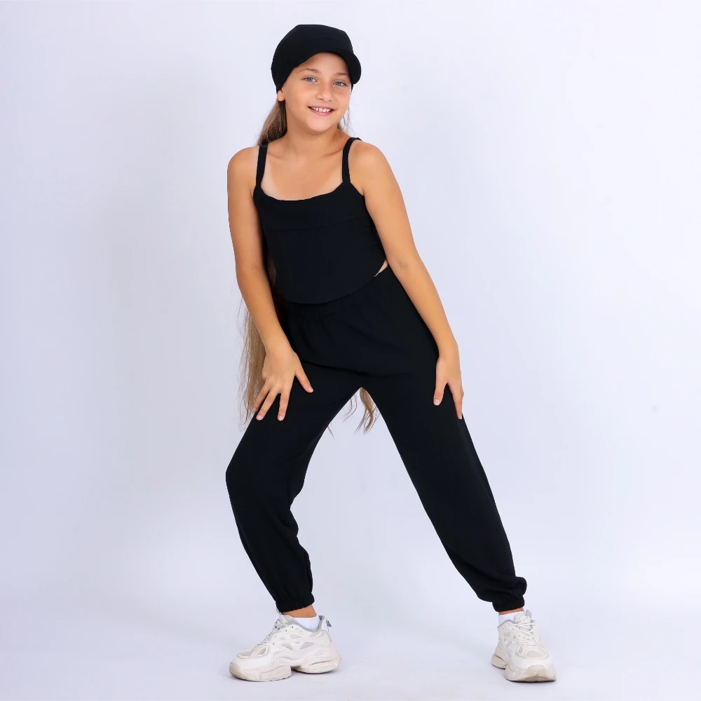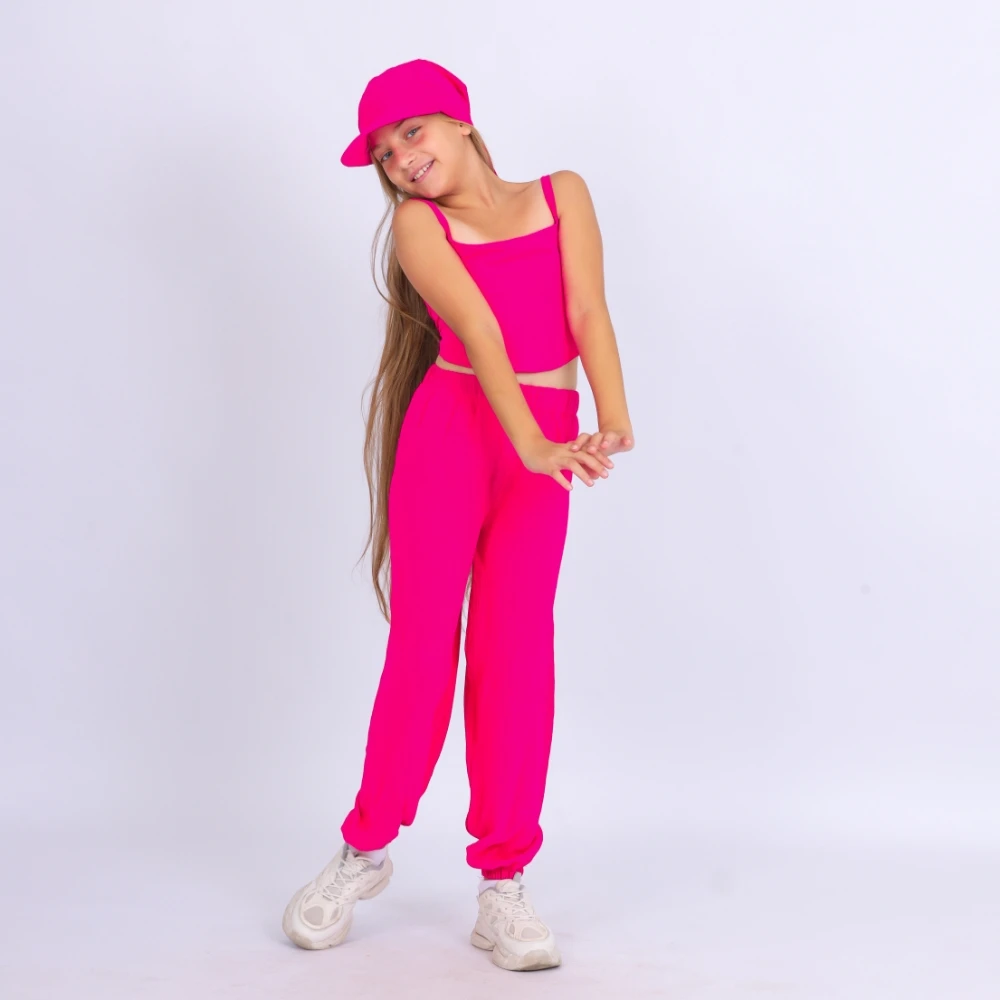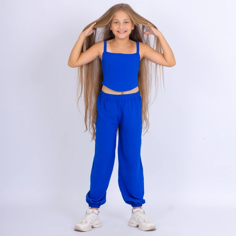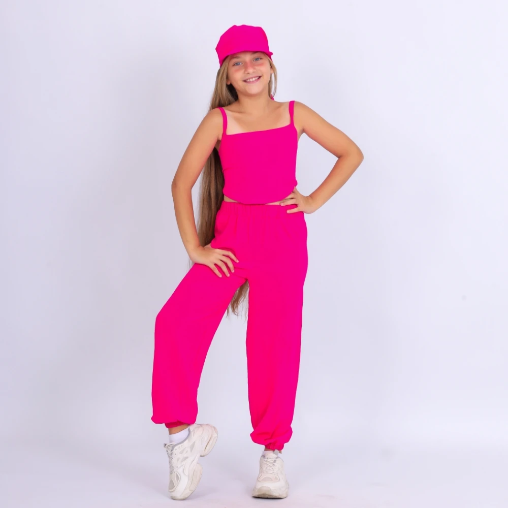 This simple outfit for young girls combines plain pants and a top with a back tie, made of CY fabric and featuring an elegant cap. This ensemble provides both comfort and style, making it the perfect choice for any occasion. The cape adds a touch of distinction and sophistication to your little girl's look, allowing her to shine with her natural beauty and innocence. Wear this outfit for a chic, comfortable, and contemporary look.