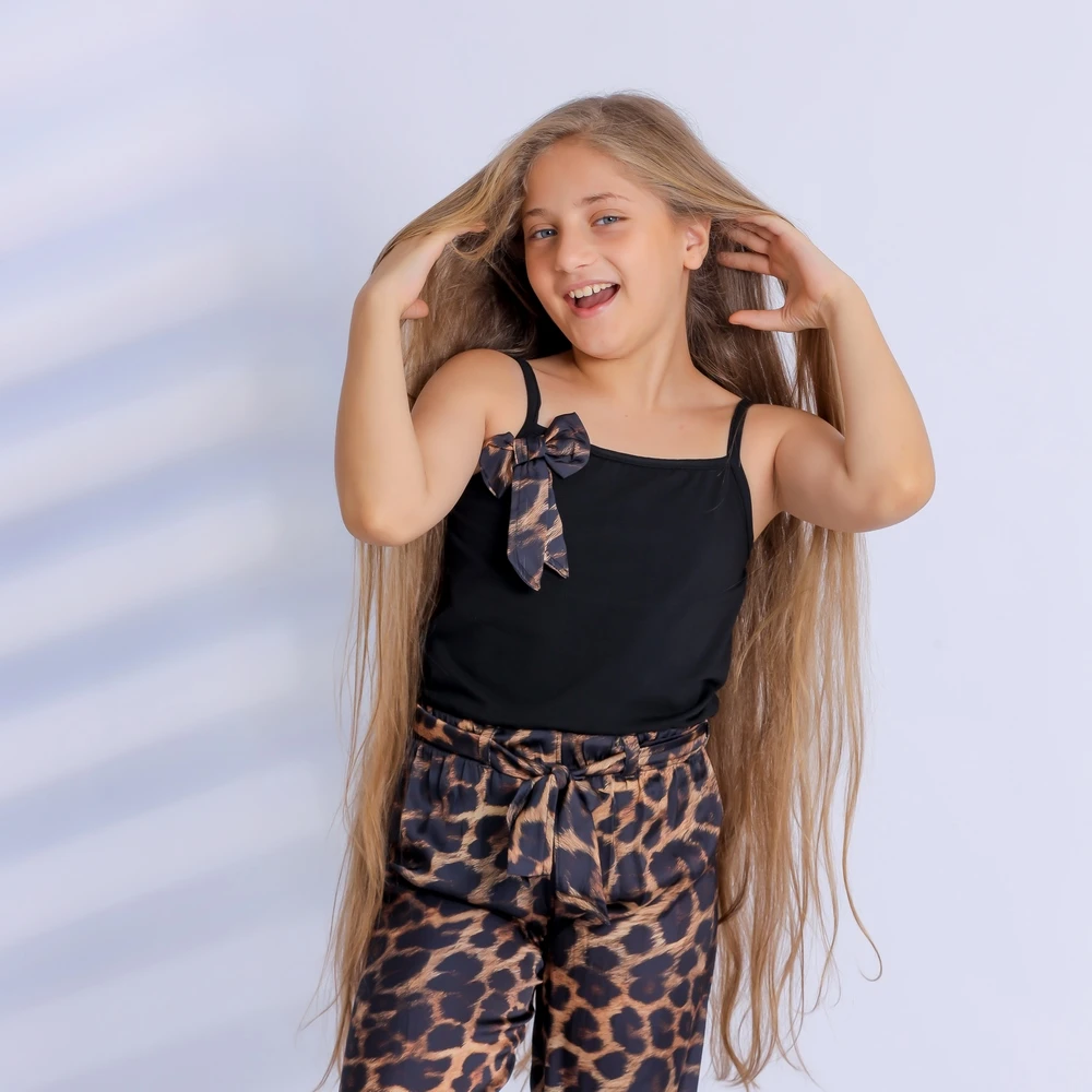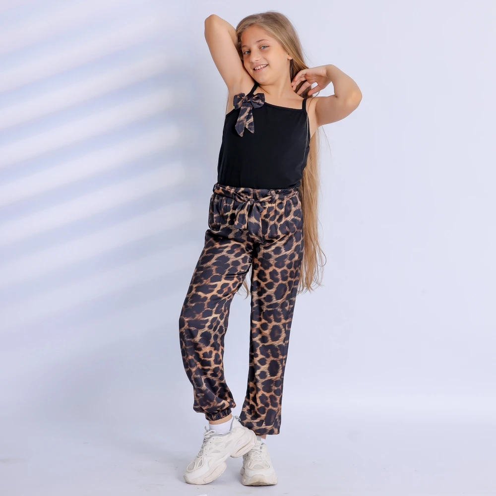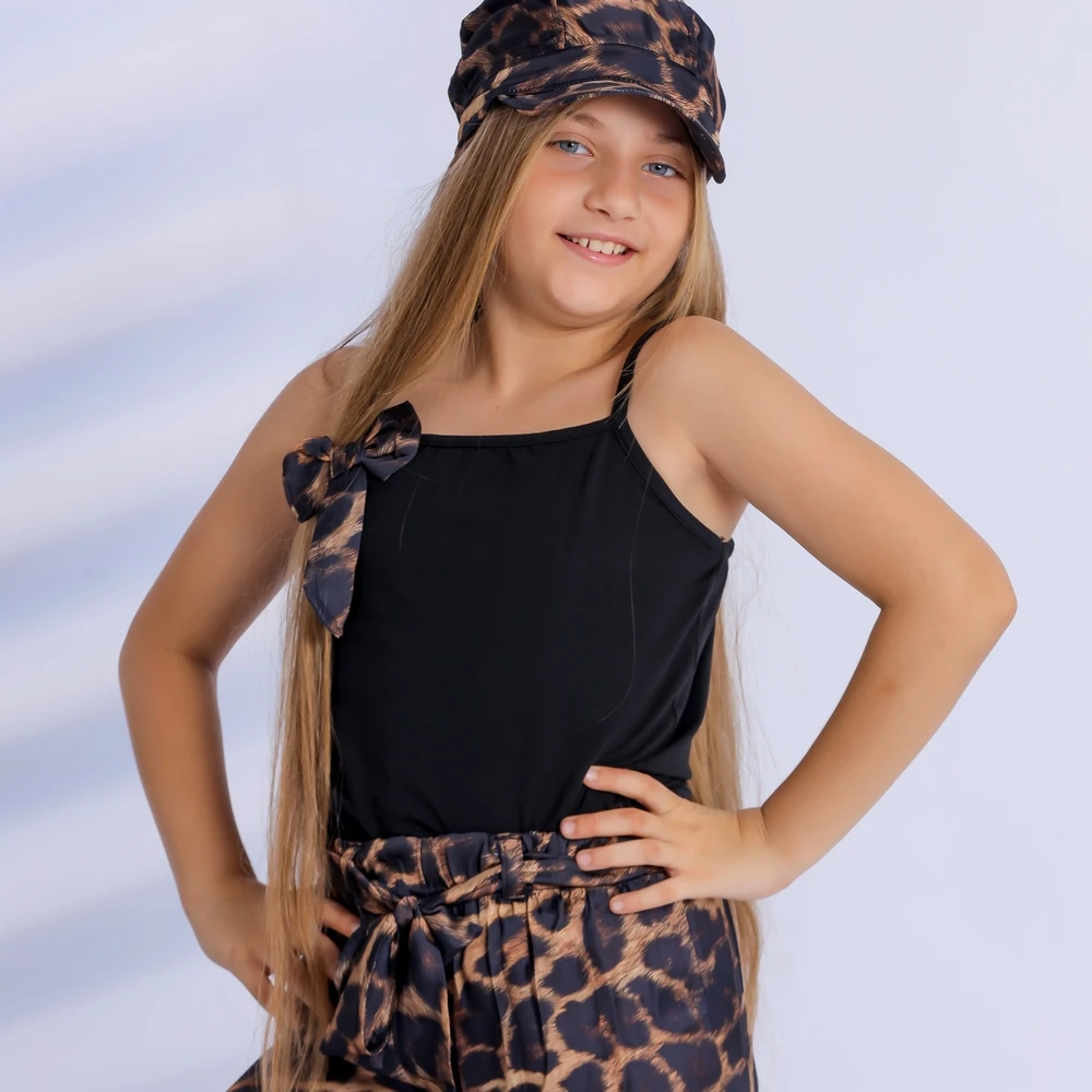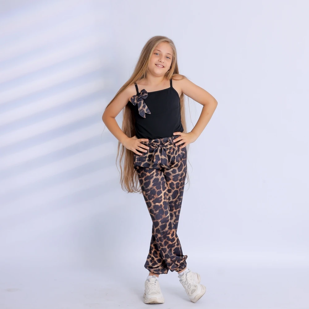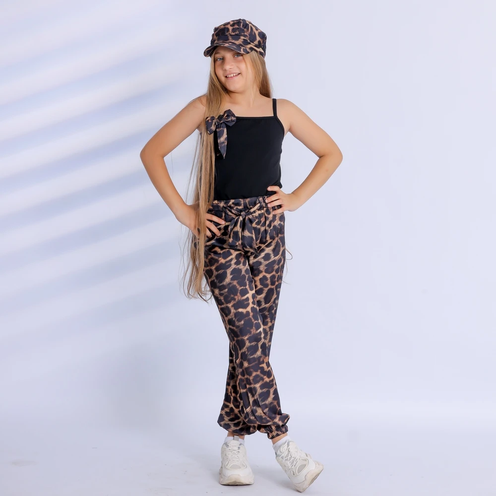 “Add a touch of wild elegance to your child’s٠wardrobe with the dream outfit! Satin tiger-print pants that reflect the spirit of adventure with every step, a soft cotton top in vibrant colors that adds comfort and style to every move, and a trendy cap that completes the look with unique flair. Make every day an adventure filled with color and style, where comfort meets beauty in one design!”